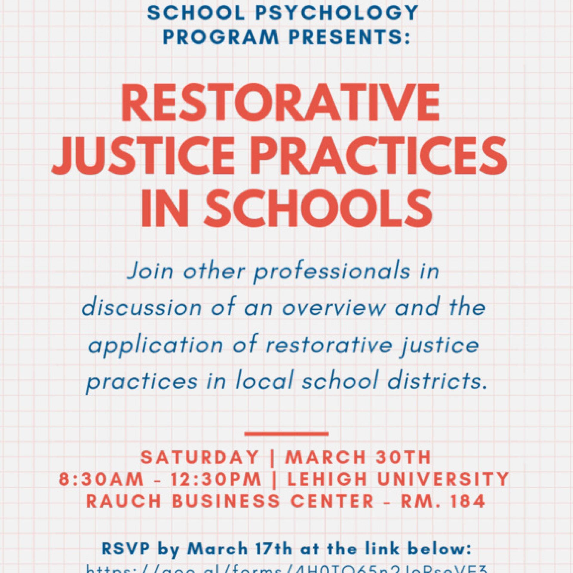 calendar_today Saturday, March 30 Restorative Justice Practices in Schools | Education schedule8:30am to 12:30pm location_onRauch Business Center info On Campus