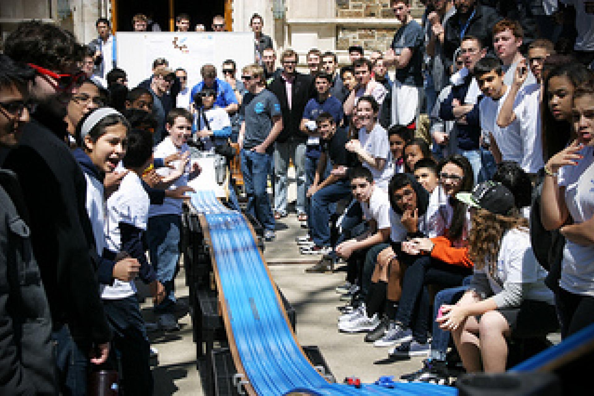 Thirty-two teams of students from Lehigh and Broughal Middle School held a design contest and a miniature car race outside Packard Laboratory on the last day of classes for the engineering students.